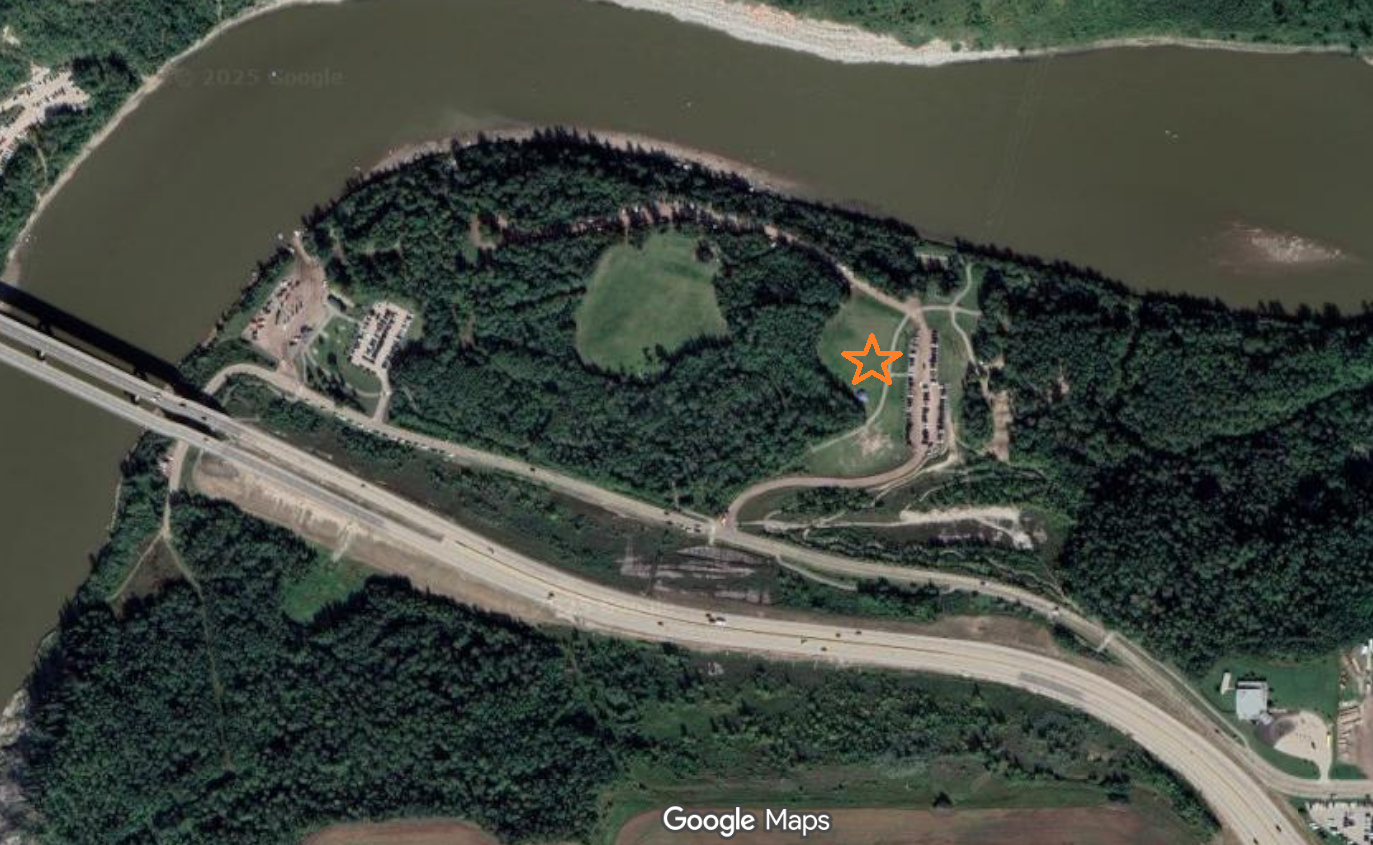 Location: East end of Voyageur Park in Devon, Alberta. Meeting near the Gazebo, approx where the orange star is located on the map below: